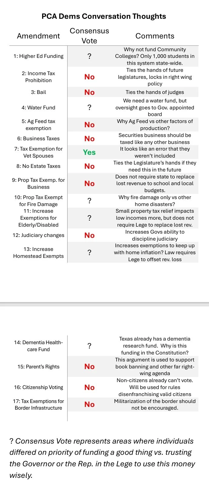 A big thanks to Elaine Campbell from League of Women Voters for leading our discussion at Monday’s meeting of the Park Cities Area Democrats. The topic was the 17 initiatives on our current ballot – and we had quite a spirited discussion!