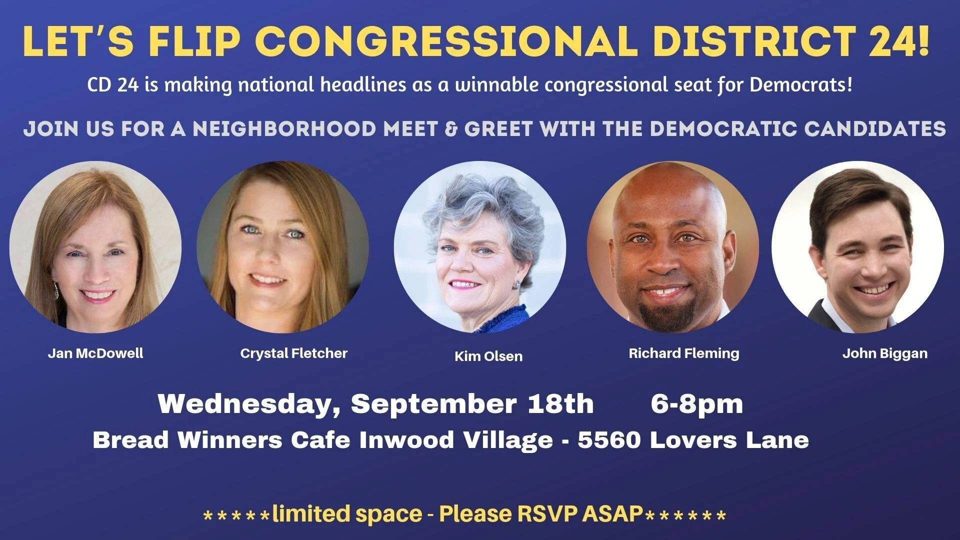 Outside Event: Meet and Greet Candidate Forum for TX-24 Wednesday, September 18, 2019 6:00 PM 8:00 PM Breadwinners Inwood Villiage (map) Google Calendar ICS