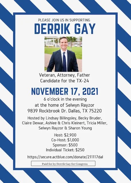Outside Event: Fundraiser for Derrik Gay, Candidate for TX-24 Wednesday, November 17, 2021 6:00 PM 7:00 PM Google Calendar ICS To RSVP, go to https://secure.actblue.com/donate/211117dal